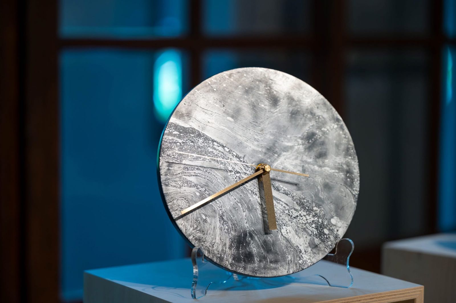 以傳統漆器手法製作,經手工反覆研磨、推光,呈現漆器溫潤光澤。課程使用漆器的蜻蛉塗技法延伸出「水蒔繪」創作方式,以水跟漆不同比重的特性,產生隨機的流動紋路,附著在平整光滑的鐘板後,再以金屬粉末加飾,製作出金色的波紋圖樣,即使是初學者也能輕易上手。