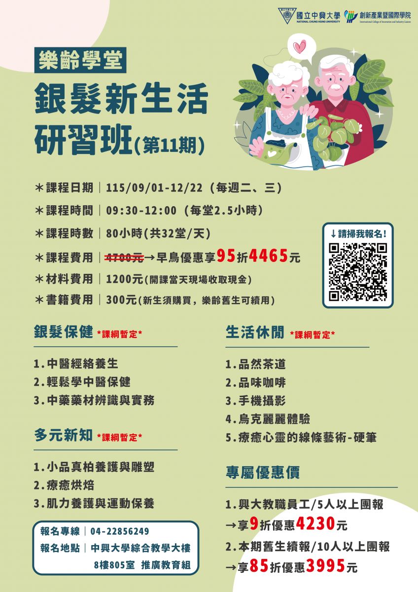 課程書籍費:300元(新生須購買,樂齡舊生可續用)
