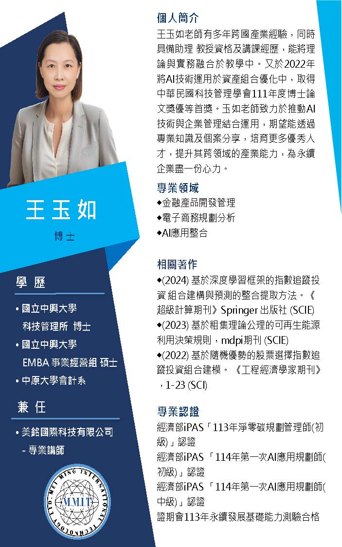 1.為未來有志於提供AI應用規劃與實施輔導的專業人士提供扎實基礎,培養實務經驗與標準化的AI規劃技能。