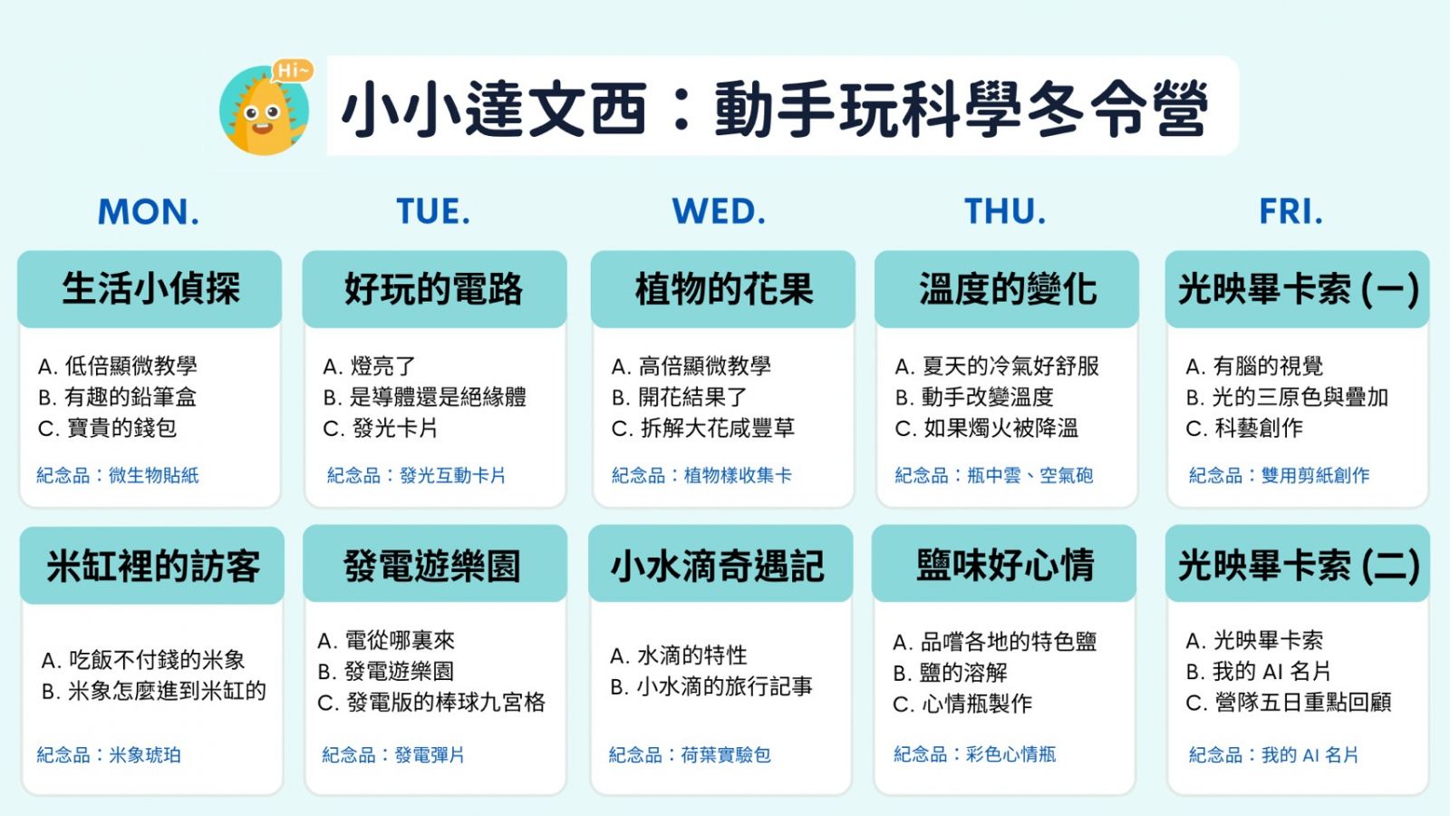 這個冬天,【小小達文西】將延續「做中學、學中玩」的精神, 帶孩子動手探索顯微鏡奧秘、實驗電路,還有更多驚喜創意課程,讓孩子在歡笑與專注中, 累積科學探究力、創造力與自信心。