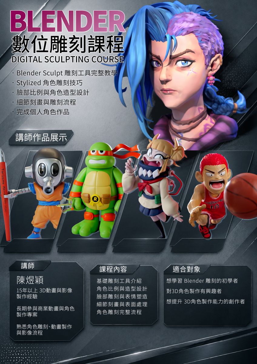 本課程將帶領學員認識 3D數位雕刻(Digital Sculpting) 的基本概念與實作流程,透過 Blender 軟體學習數位雕刻的操作技巧,從基礎形體建立、細節雕刻到簡單模型完成,讓學員體驗數位雕刻創作的樂趣。